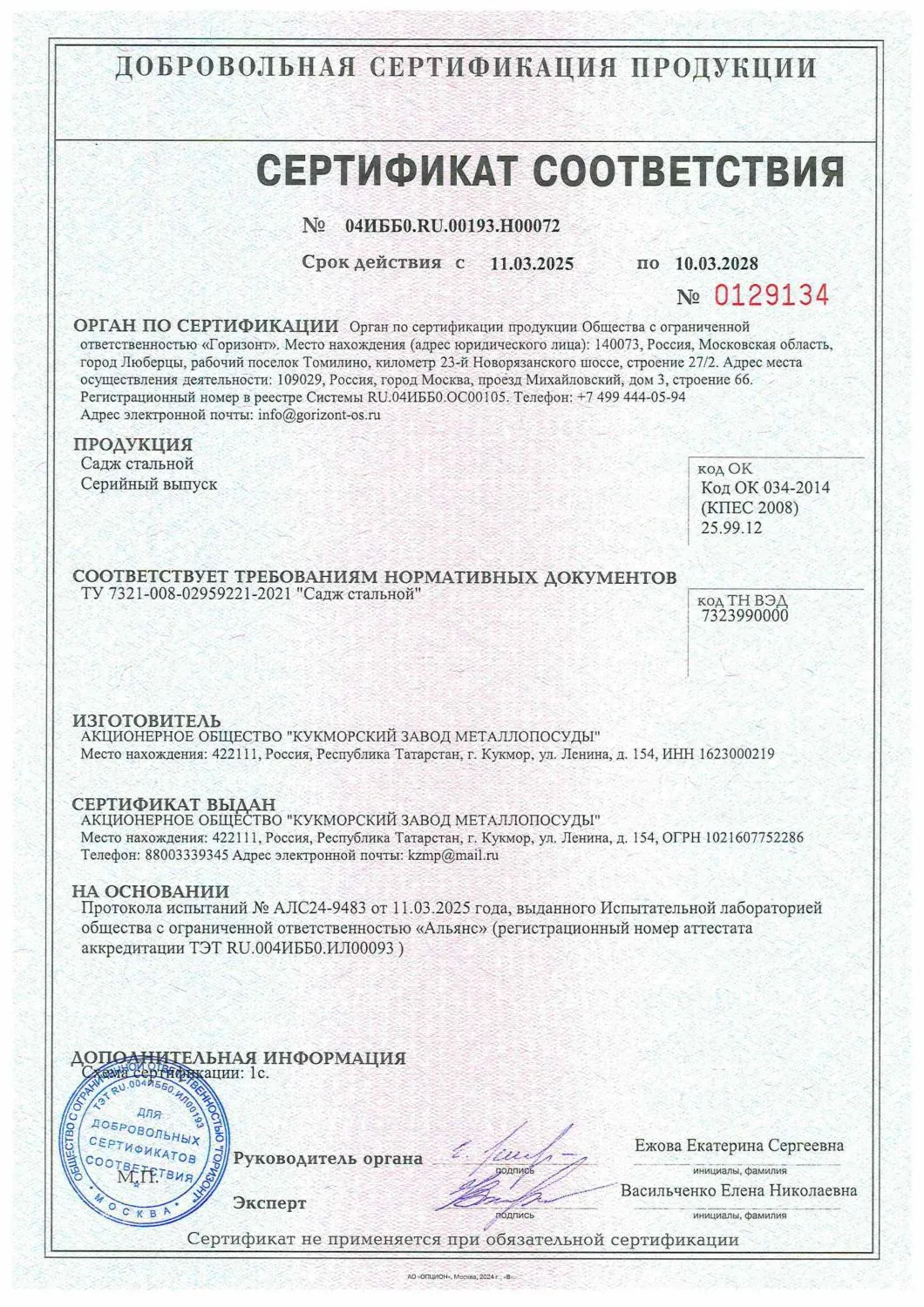 2022 Сертификат Садж стальной